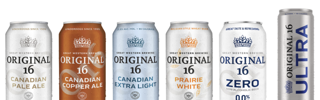 Under the Original 16 brand, we re-designed all packaging for Canadian Pale Ale, Canadian Copper Ale, Prairie White, Canadian Extra Light, O16 Zero and O16 Ultra.
